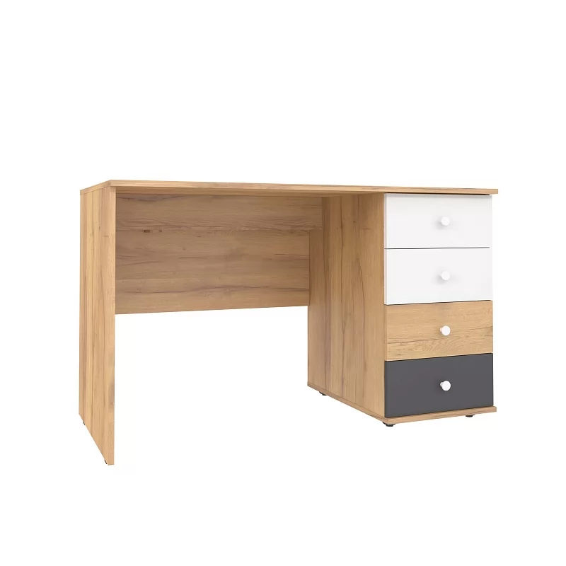 84 Стол письменный отличается нестандартным решением для столешницы, которая максимально адаптирована для потребностей современных детей и работе на компьютере. Под откидной её частью, которая открывается за плавный вырез, прячется ниша для хранения и отверстие с заглушкой для вывода проводов, чтобы они не запутывались и не мешали ребенку. Если ребенок ещё не занимается за компьютером, то нишу можно использовать и для размещения органайзеров с карандашами, фломастерами и красками, чтобы они не отвлекали от творчества. Дополняют стол ящики на шариковых направляющих. За счет просторной рабочей поверхности, а также возможности левосторонней и правосторонней сборки 84 Стол письменный одинаково удобен как для левши, так и для правши. Письменный стол входит в программу Ширина ВРАЗМЕР, а это значит, что его ширину можно увеличивать и уменьшать на 150 мм с шагом в 1 мм. Таким образом, он легко подстроится под планировку вашей комнаты.