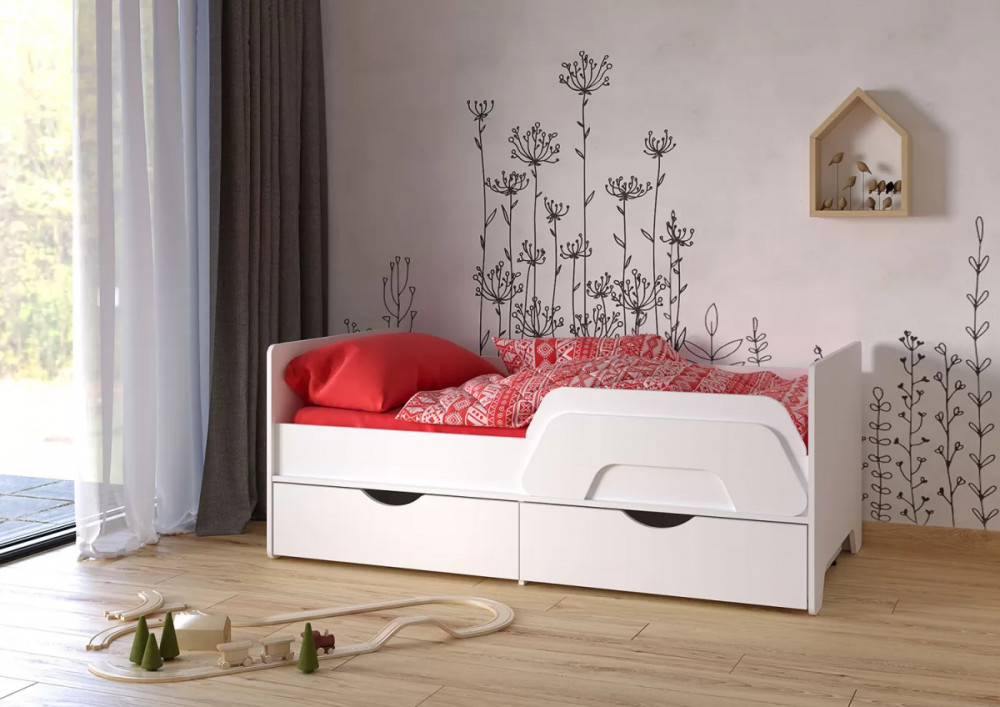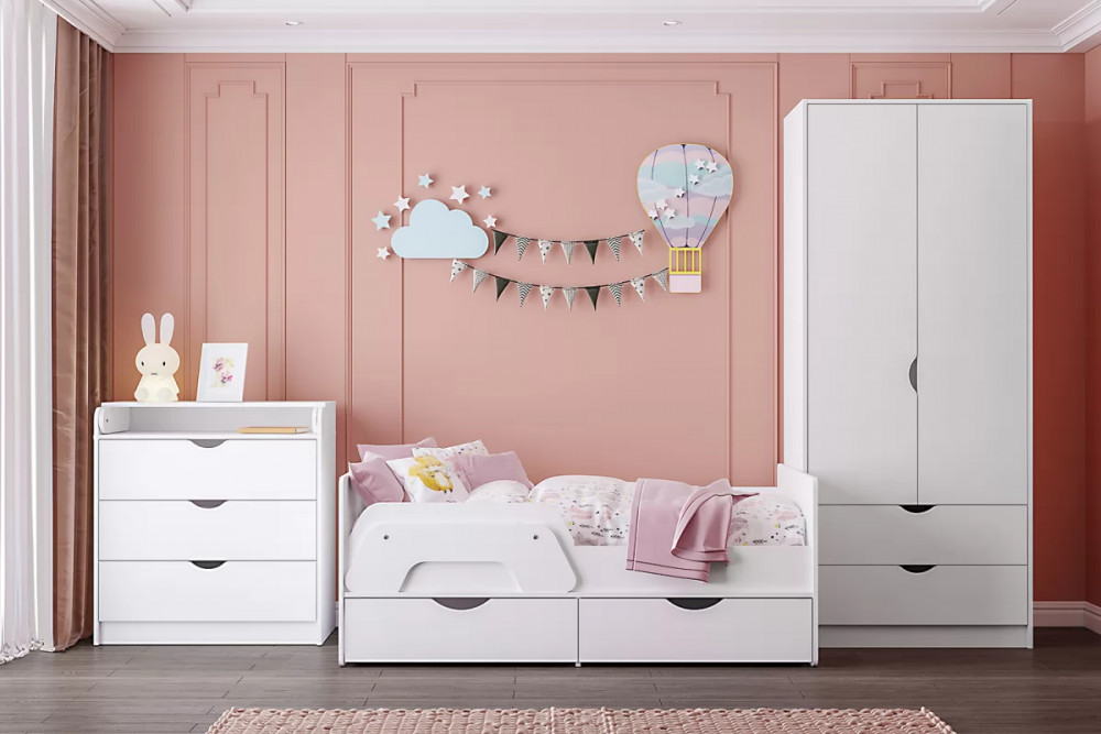 Ваш подрастающий малыш несомненно оценит изящный дизайн кроватки, а удобный съемный бортик придаст уверенность ответственным родителям в безопасности детского сна. Все элементы кровати предусмотрительно избавлены от острых углов и оформлены более толстой кромкой. Выкатные ящики - это вместительная система хранения для вещей и игрушек вашего ребенка. Удобный шкаф для одежды дополнен двумя выдвижными ящиками, что значительно увеличивает функциональность изделия. Комод оснащён складным пеленальным столиком. На всех изделиях ручками служат вырезы в фасадах, все выдвижные ящики имеют внутренние перегородки для лучшей организации хранения.