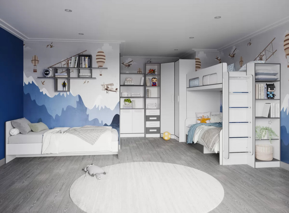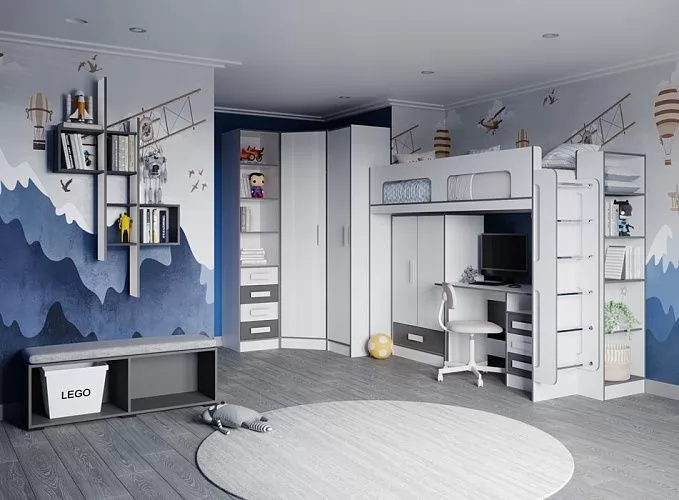 ОсобенностиКровать чердак спроектирована под одно спальное место и может дополняться вторым спальным местом (кровать с ящиками) или рабочим местом (шкаф малый, письменный стол) .Полку навесную можно повесить как горизонтально так и вертикально. Тумбу открытую можно доукомплектовать мягким сиденьем из ткани велюр цвета Серый. Все модули из коллекции имеют кромку серого цвета. Из ЛДСП Графит Серый выполняются отдельные элементы: