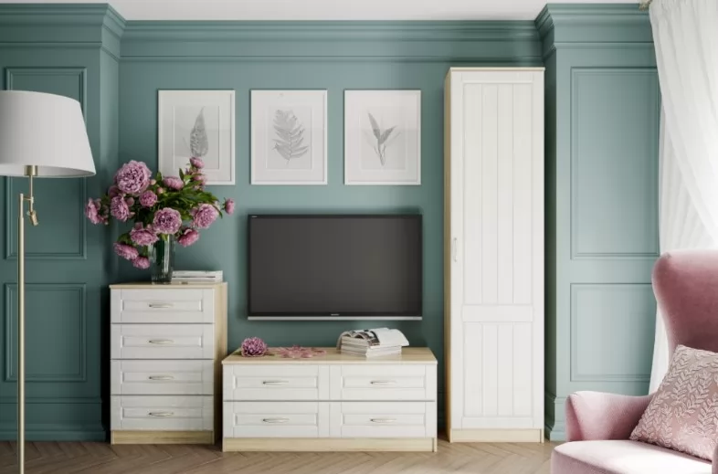Комод, тумба под TV и шкаф для одежды – данный комплект мебели не перегрузит пространство, при этом обеспечит необходимый функционал: места для хранения документов, декора и даже одежды (шкаф оснащен выдвижной штангой); зона TV.