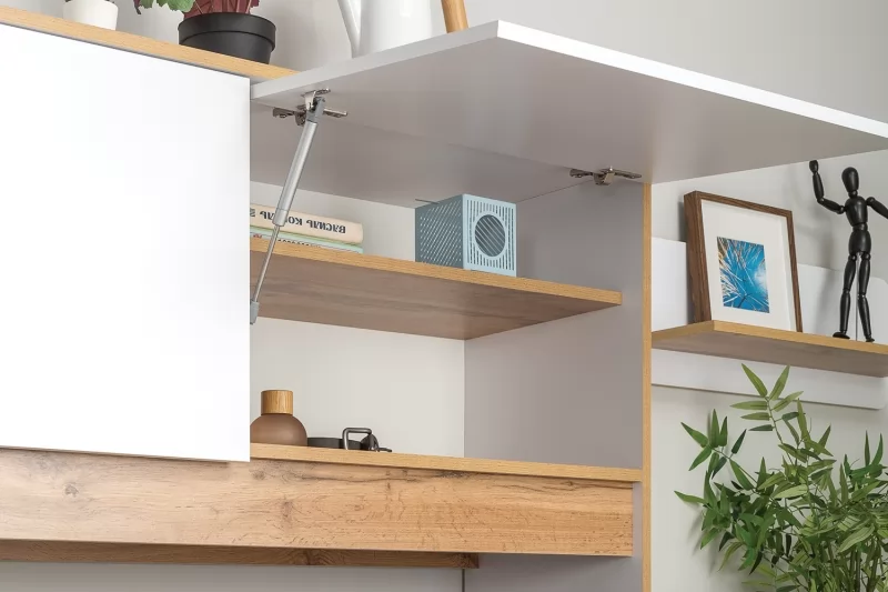 Светлая и аккуратная молодёжная мебель. Основой модульной системы является кровать-трансформер. Её столешница имеет постоянный горизонт, то есть при трансформации не нужно убирать вещи. Система хранения с подъёмными фасадами значительно расширяет функционал. Также имеются письменный стол с надстройкой и полкой, шкафная группа и комод с тумбочкой. Вместе они позволяют создавать разноразмерные композиции, примеры которых - на фото слева.