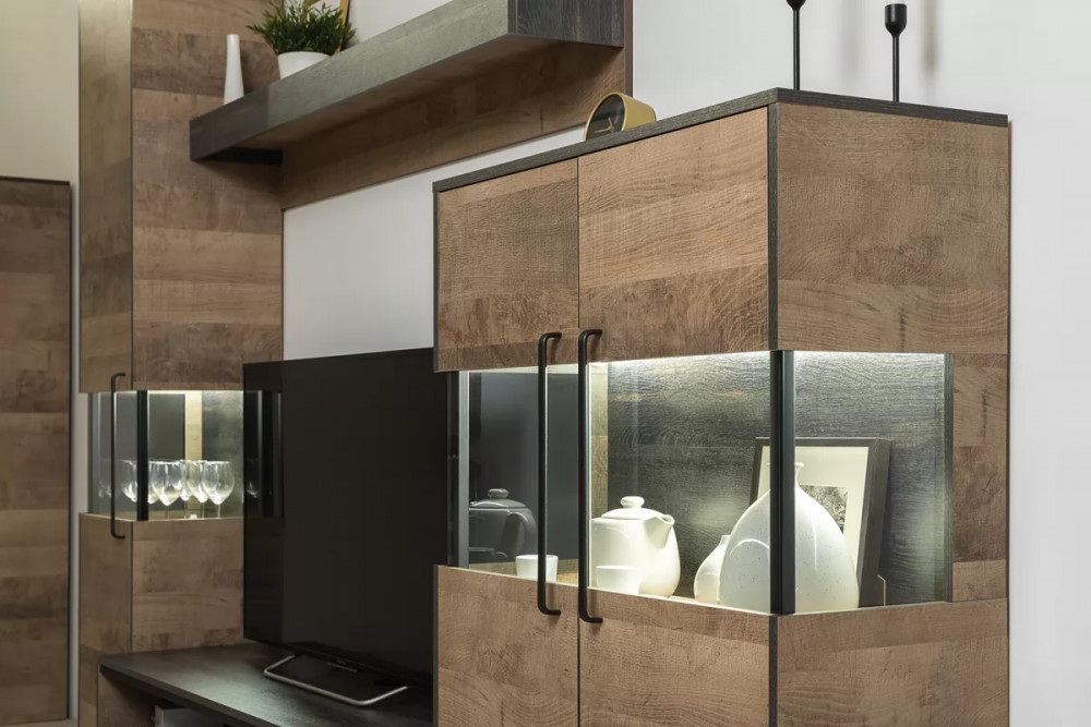 Лицевая фурнитура с тем же покрытием придаёт мебели индустриальную эстетику.