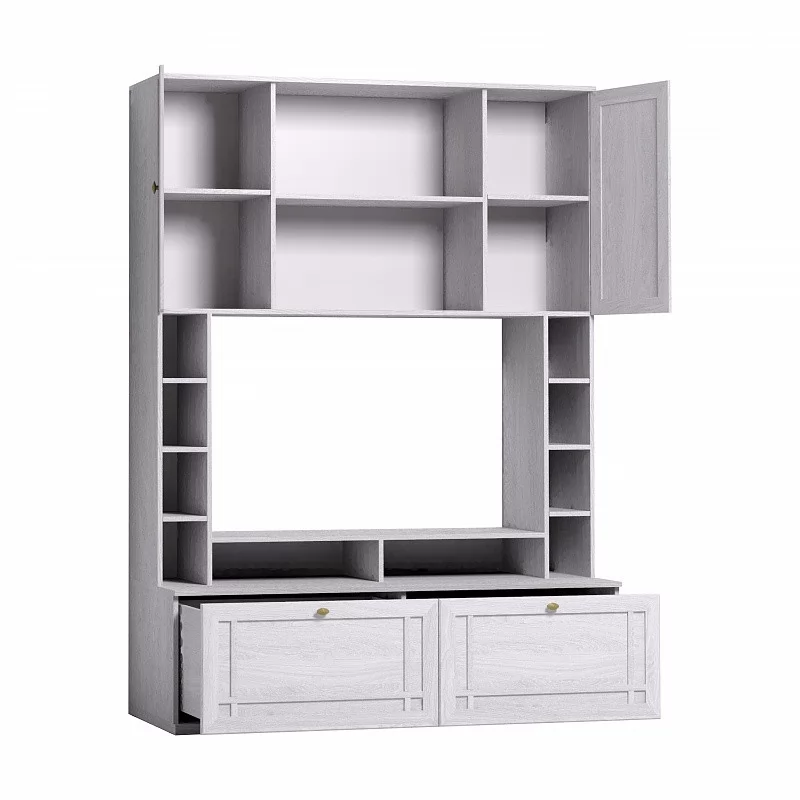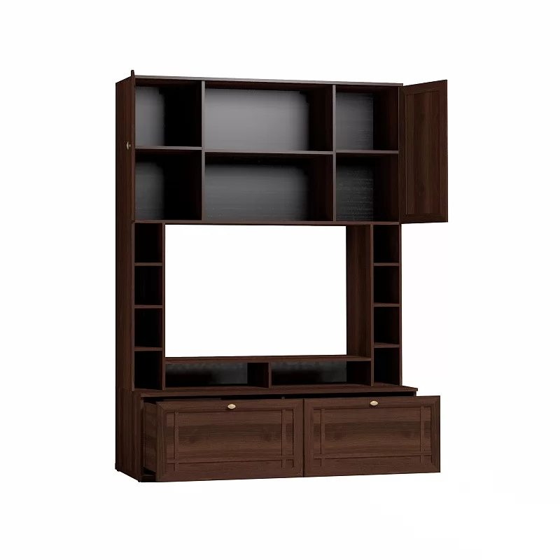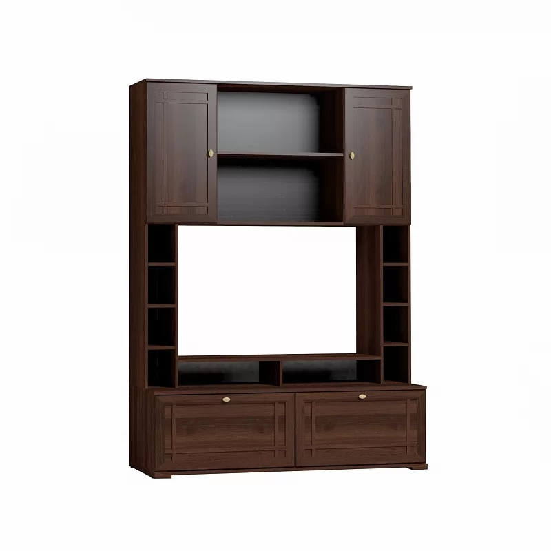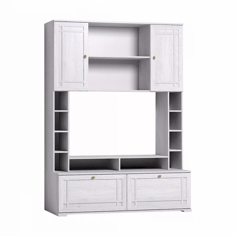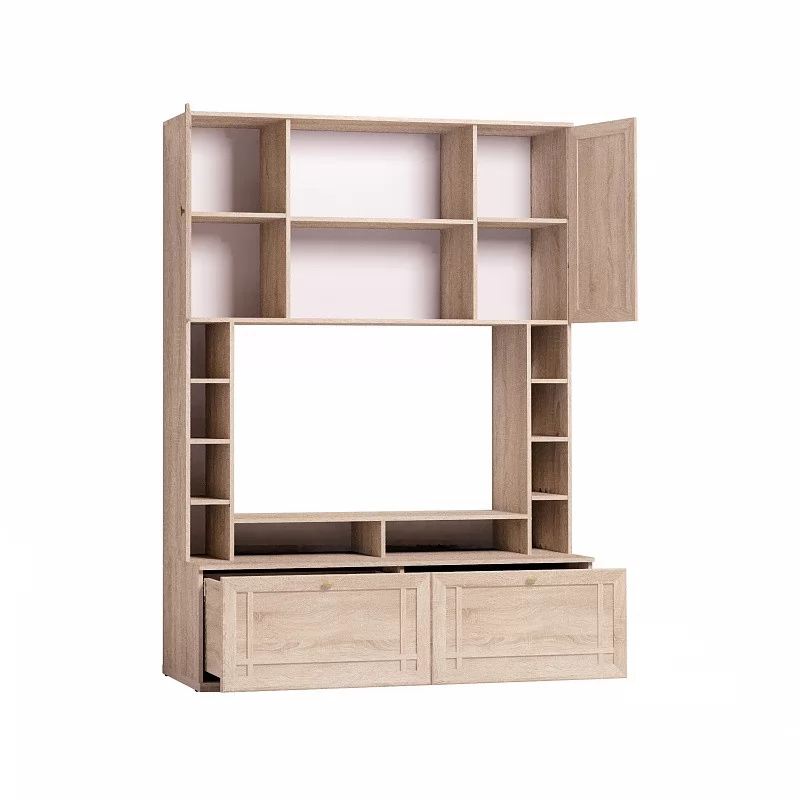 Шкаф МЦН вмещает телевизор диагональю до 44”: высота ниши 725 мм, ширина - 1154 мм. Глубина нижних выдвижных ящиков - 400 мм. Они комплектуются шариковыми направляющими, которые обеспечивают им минимальный люфт и высокую прочность. Один ящик выдерживает нагрузку до 20 кг. Подставку на тумбе под ТВ можно закрепить над нишей, как дополнительные вместительные полки.