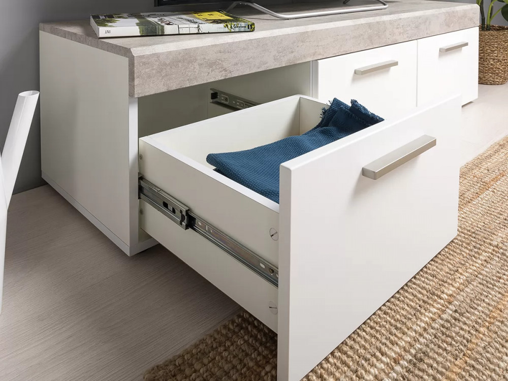 Тумба под ТВ Петра 13.281 будет отличным дополнением интерьера любой комнаты. Изделие поможет разместить телевизор для более комфортного просмотра новостей, сериалов и различных телепередач. Три вместительных выдвижных ящика пригодятся для хранения большого количества различных вещей и предметов. Шершавый и акцентный каменный декор создаёт чёткий контраст с мягкими белыми фасадами, окутанными плёнкой софт-тач.