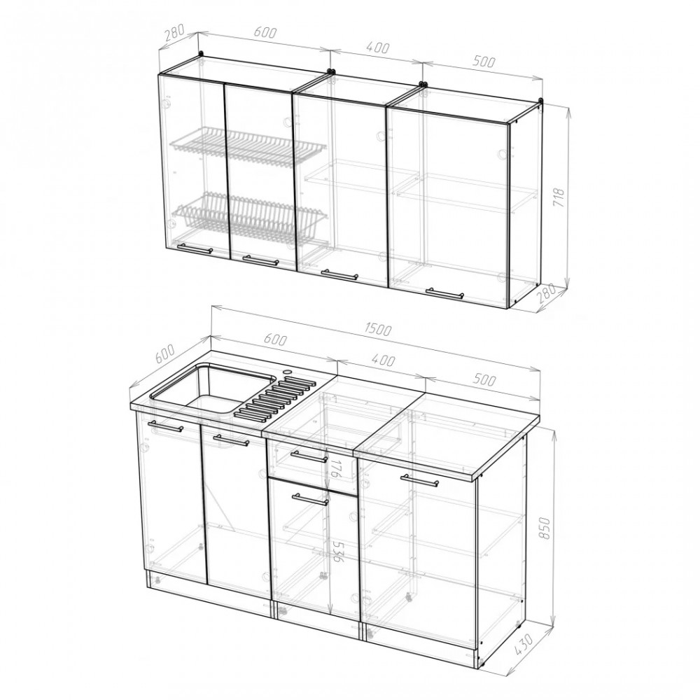 Мойки, смесители и посудосушители в комплекты гарнитуров не входят.