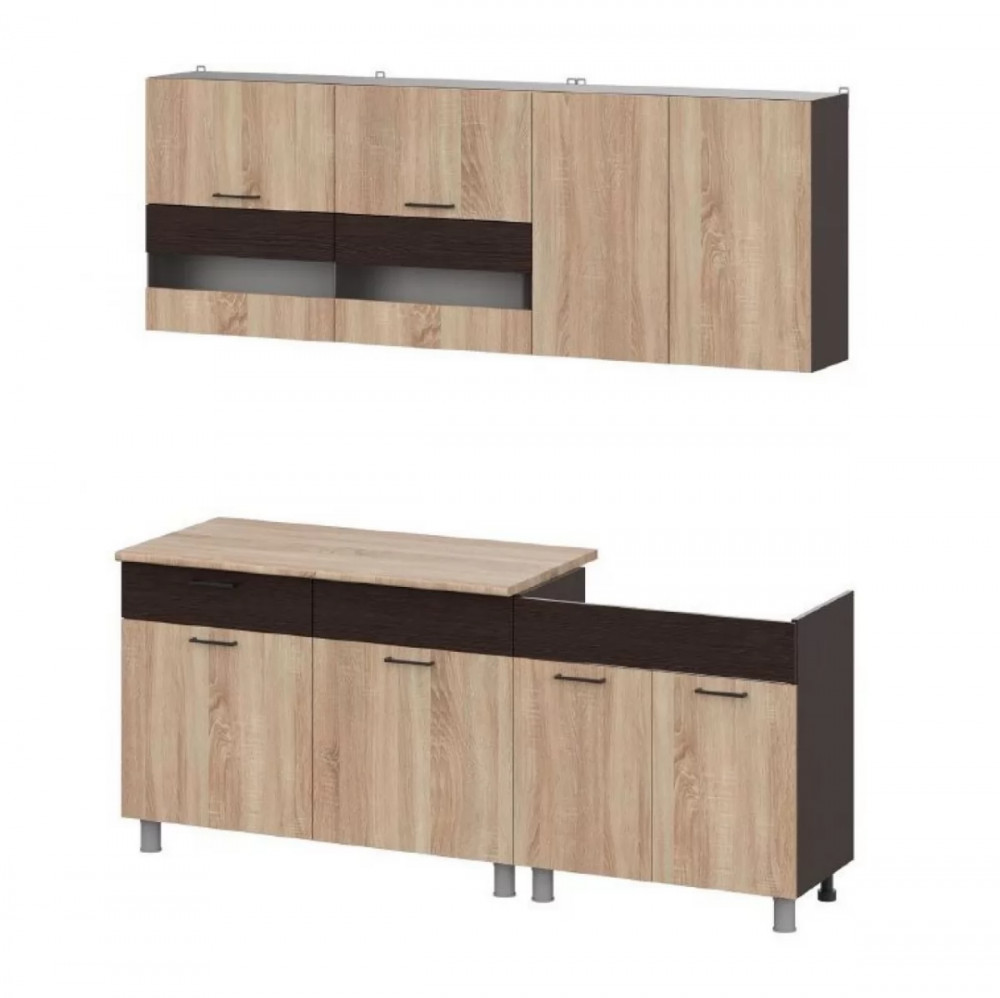 Размеры (см): ширина - 200, высота - 214, глубина - 60.Материал: ЛДСП.Цвет: венге, дуб сонома.Стиль: современный.Особенности:Готовая кухня Босфор выполнена в красивом контрастном сочетании цветов дуб венге и дуб сонома, что позволяет ей гармонично вписаться в любой интерьер.Кухонный гарнитур состоит из двух навесных шкафов шириной 80 см и 120 см и также двух напольных модулей шириной 80 см и 120 см соответственно.Верхний шкаф 80 см оснащен двумя полками и двустворчатым фасадом, 120 см - с двумя горизонтальными откидными фасадами и 4-мя полками.Напольный шкаф 80 см без столешницы рассчитан под мойку и его открытая задняя стенка удобна для монтажа необходимых коммуникаций.Напольный шкаф 120 см со столешницей толщиной 26 мм и выдвижным ящиком на шариковых направляющих подойдет для организации рабочей зоны на кухне.На фасадах навесных шкафов отсутствуют фурнитура (кроме верхней горизонтальной створки) и открываются за нижний торец.На фасадах напольных шкафов установлены стильные ручки-скобы.Гарнитур изготовлен из ЛДСП, этот материал прост в уходе, обладает высокой устойчивостью к механическим воздействиям.Регулируемые опоры позволяют надежно установить напольный модуль на любой поверхности.Смеситель и мойка в комплектацию не входят, приобретаются отдельно.Реальный цвет товара может отличаться от цвета товара на фотографии.Объем товара (м3): 0,22.Производитель: Россия.Вес: 113 кг.Количество упаковок: 6.
