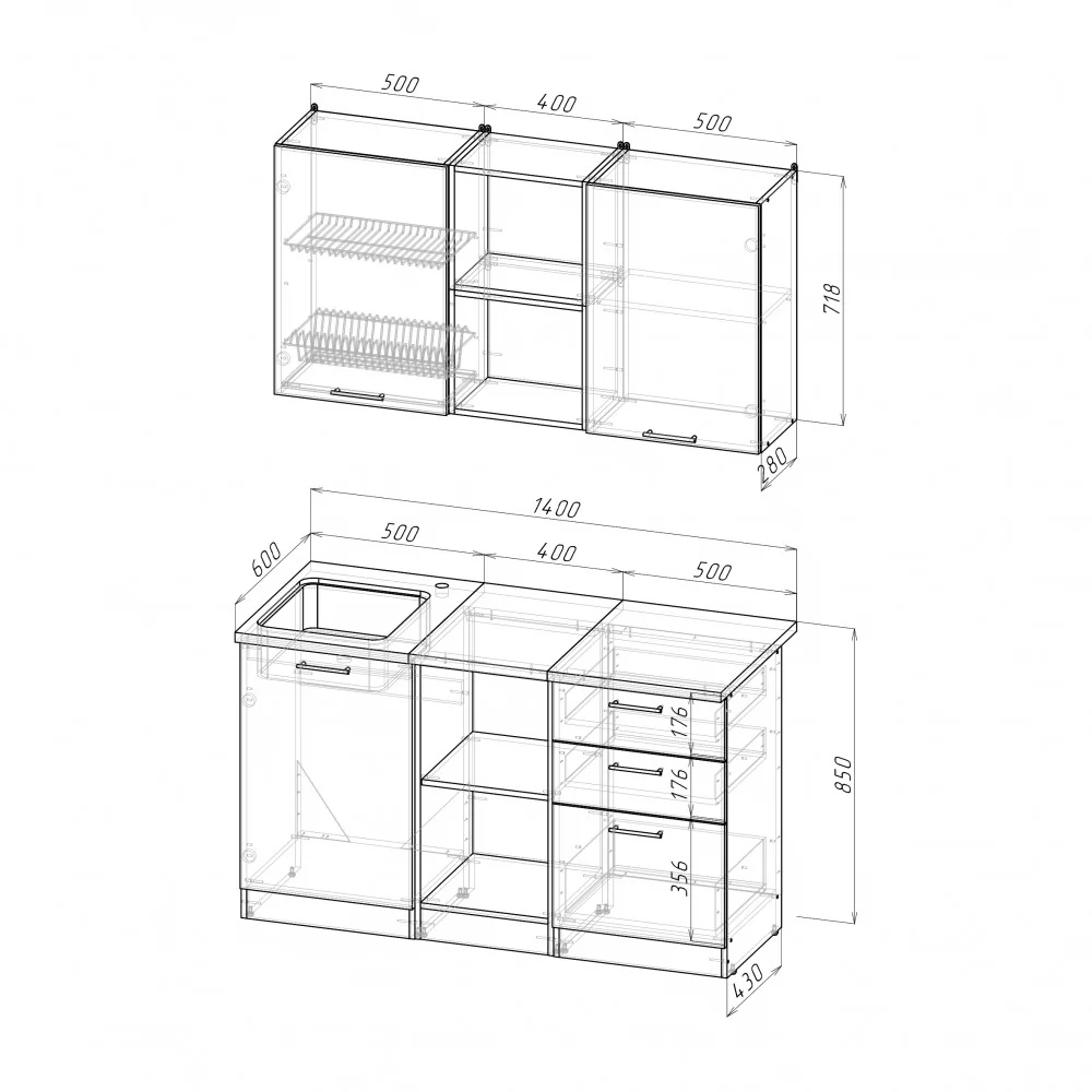 Мойки, смесители и посудосушители в комплекты гарнитуров не входят.