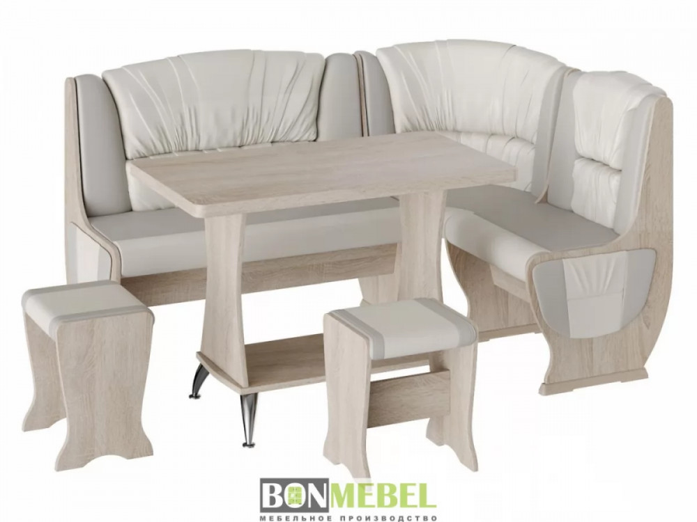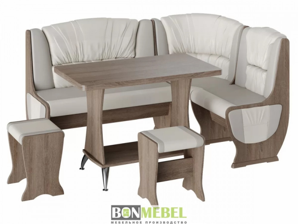 Мягкий уголок для кухни с оригинальной обивкой добавит уюта кухонному интерьеру. Особенно понравится такая модель тем, кто любит долгие посиделки с семьей или друзьями за чаепитие. Сборка скамьи универсальная — вы можете определить угол как с правой, так и с левой стороны. Скамья дополнена двумя ящиками под сиденьем. Обивка на табуретах и скамье выполнена из искусственной кожи с наполнителем из поролона. Каркас изделий изготовлен из ЛДСП, на ножках установлены пластиковые накладки.