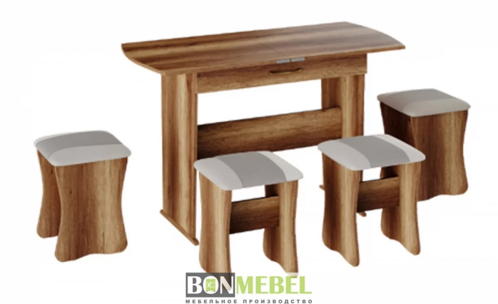 Обеденная группа с табуретами Тип-2 станет практичной и уютной обеденной зоной для вас и ваших гостей. Комплект рассчитан на четыре персоны. Встроенный механизм трансформации позволит увеличить ширину стола почти с 750 мм до 1200 мм. Обивка из экокожи устойчива к различным загрязнениям и не требует обработки специальными средствами. Мягкие сиденья табуретов имеют мягкое и упругое наполнение, что повышает уровень комфортабельности. Различные варианты расцветки помогут подобрать идеальный комплект. Для изготовления изделий используется прочная ЛДСП. Обивка табуретов выполнена из искусственной кожи.