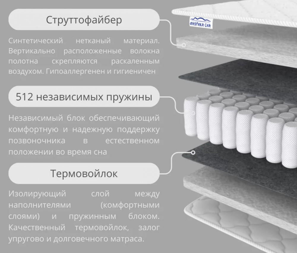 Струттофайбер (3 см): Этот материал представляет собой инновационное волокнистое вещество, созданное специально для обеспечения отличной вентиляции и влагоотвода. Он обеспечивает равномерное распределение веса тела и смягчает поверхность матраса.