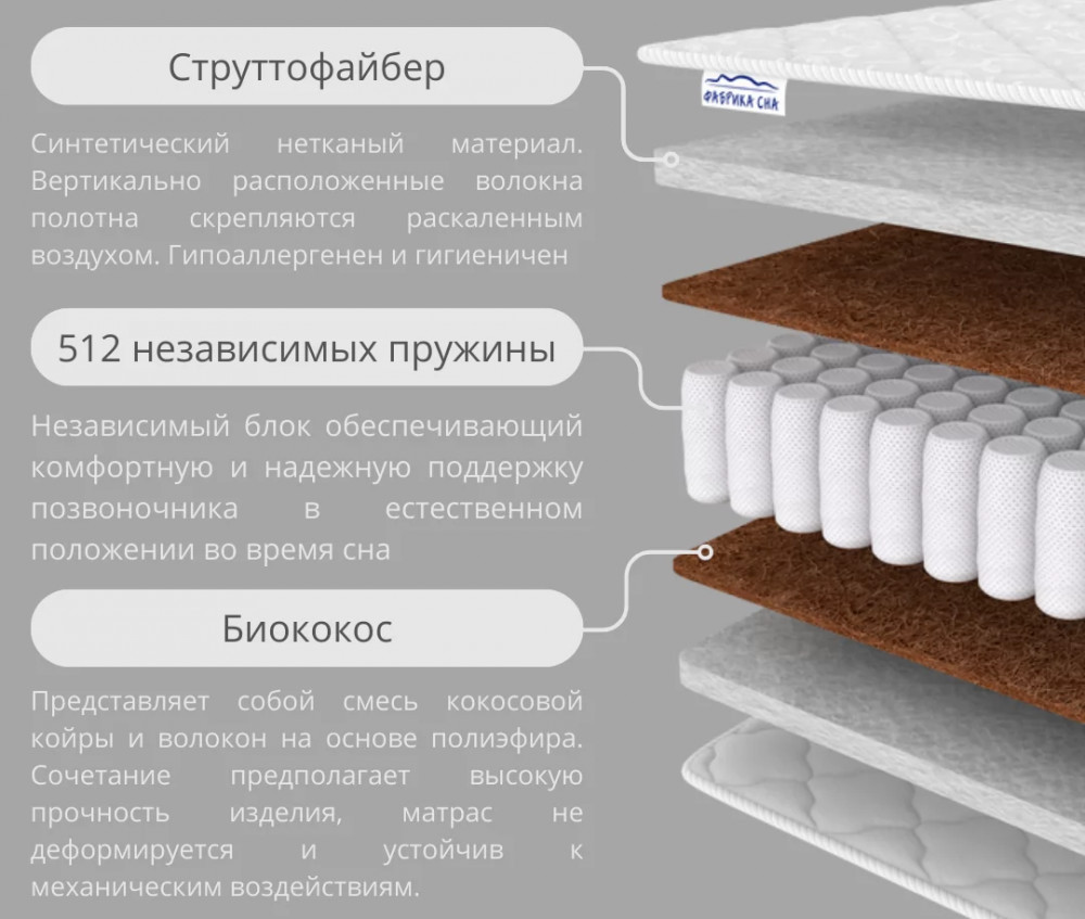 Струттофайбер (3 см): Этот материал представляет собой инновационное волокнистое вещество, созданное специально для обеспечения отличной вентиляции и влагоотвода. Он обеспечивает равномерное распределение веса тела и смягчает поверхность матраса.