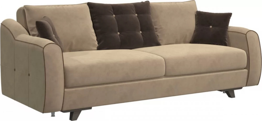 Несколько движений - и диван-кровать превращается в удобное спальное место, а независимый пружинный блок способствует приятному и здоровому сну. В просторный ящик для постельного белья поместится немало принадлежностей для сна.<br /> Стиля модели добавляют контрастные подушки и строчки по периметру отделки. Мягкий кофейный оттенок делает общий дизайн более сдержанным и лаконичным, в то же время обращая на себя внимание.