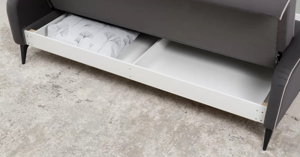 Габаритысложенный (Д x Г х В, мм): -2210 x 910 x 860разложенный (Д x Г х В, мм): -2210 x 1130 x 690спальное место (Д x Ш, мм): -1920 x 1130высота посадки (мм): -460глубина сиденья (мм): -590высота спинки (мм): -450высота подлокотника от сиденья (мм): -150-220максимально допустимая нагрузка: -80 кг на 1 посадочное местоМеханизм трансформации-КнижкаБельевой ящик-есть с перегородкой по центру (2 отделения)размер отделения (Д x Ш, мм): 740 x 885 x 885Варианты исполнения-5 артикуловсочетание тканей только как на фотоМатериалыосновная ткань: -Velutto (велюр)выполняется в тканях: Velutto 19 (темно-серый)/Velutto 08 (светлый кварцевый серый)каркас: фанера деревянный брус ДСП ДВПдекоративные подушки, шт: -2наполнитель подушек: -крошка ППУ и полиэфирное волокно «шарики»материал опор: металлцвет опор: черныйвысота опор (мм): 165ДекорСпинка и сиденье разделяются пополам двойным кантом по центру и одинарным по краям сидения, для придания одной единой формы. Подлокотники с изгибом на лицевой стороне и мягкими закругленным углом со складками, с выраженным контрастным ровным кантом по внешнему контуру изделия и изогнутой линией канта.Назначениев гостиную в молодежную в гостевую комнату в кабинет в офисТребуется ли сборка-даУпаковкаколичество коробок, шт: 2общий вес с упаковкой, кг: 58,1