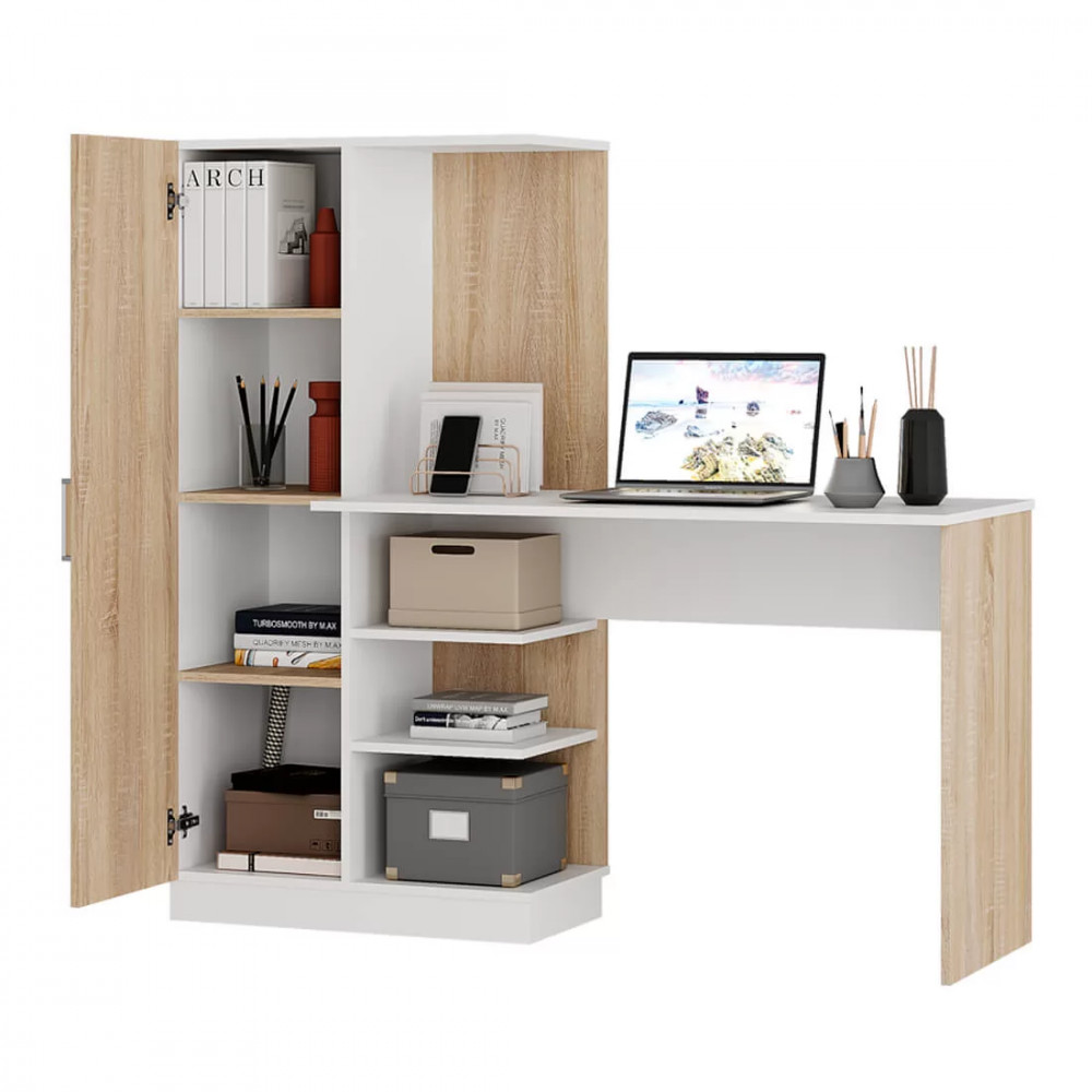-модель сделана из ЛДСП двух цветов – белого и сонома, -благодаря такому цветовому решению, изделие будет выигрышно смотреться в любом интерьере, -конструкция модели представляет собой вместительную столешницу, зону с открытыми полками, -небольшой пенал с распашной дверцей, в котором можно хранить необходимые для занятий вещи.