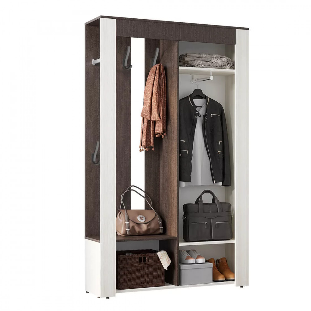 -наполнение представляет собой распашной шкаф со встроенным в дверцу зеркалом, открытую нишу с крючками для верхней -одежды и отделение для хранения обуви,