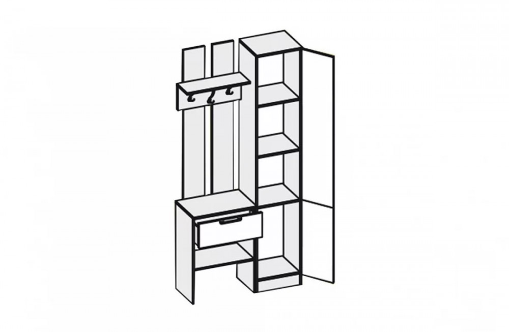 Прихожая имеет простой дизайн и прямые формы. Она состоит из вешалки с тумбой и пенала. Открытая вешалка оборудована полкой для головных уборов, тремя 3-х рожковыми крючками для одежды, ниже выдвижной ящик на роликовых направляющих, под ним открытая ниша с полкой. За распашными дверьми пенала три полки. Тип сборки и направление открытия дверей определеяется при сборке.