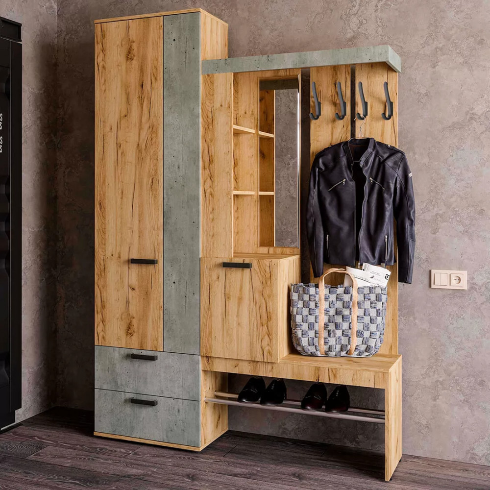 Идеальный выбор для современного интерьера, особенно в стиле лофт, – это прихожая Трамп. Модель выполнена из ЛДСП двух цветов – крафт и бетон. Изделие имеет все необходимые зоны для размещения вещей в прихожей: крючки для верхней одежды, открытые и закрытые ниши, шкаф с выдвижной штангой и зону для хранения обуви. Красивое и практичное решение по лучшей цене — это прихожая Трамп в компании «Семья Мебелони».