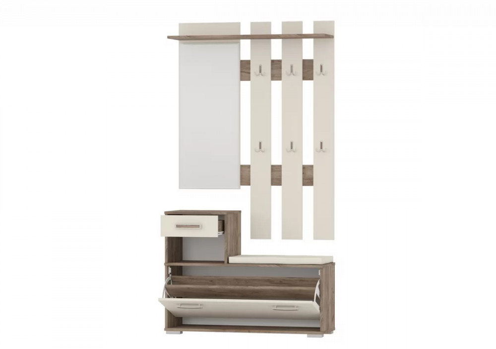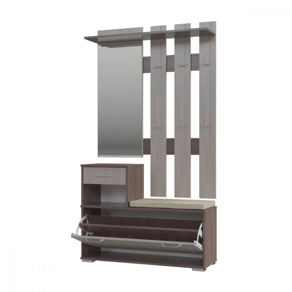 Тумба для обуви состоит из обувницы с откидной дверкой, в которой может разместиться до 8 пар обуви, выдвижного ящика для мелочей и открытой ниши.