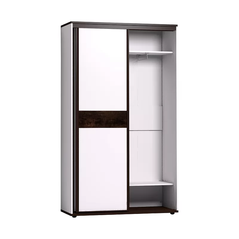 Небольшой шкаф-купе в прихожую с продуманным внутренним наполнением позволяет рационально использовать площадь небольшого коридора в квартире. В комплектацию шкафа входят: выдвижная штанга и регулируемые по высоте полки для одежды. Два фасада - зеркальный и глухой - перемещаются на стальной системе Найди, которая обеспечивает легкость открывания, плавность и бесшумность хода. Зеркальный фасад проклеен с обратной стороны защитной пленкой. Шкаф-купе создан на контрасте: белый корпус, белый глухой фасад и горизонтальные детали в декоре Орех Шоколадный, трек и профили цвета венге, темная брашированная вставка из дерева. Регулируемые опоры компенсируют незначительные неровности пола.