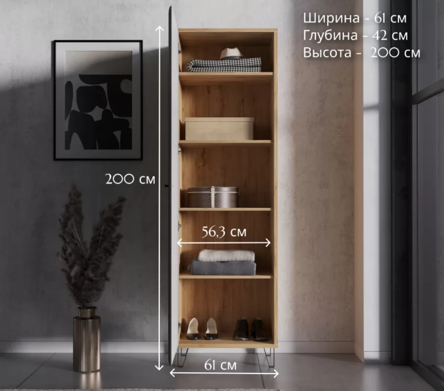 Шкаф-пенал имеет простую, но вместительную конструкцию. За распашной дверкой с металлической ручкой расположены глубокие полки. Внутри вы можете расположить большой перечень вещей: от головных уборов и одежды в стопках до обуви и дамских сумочек.