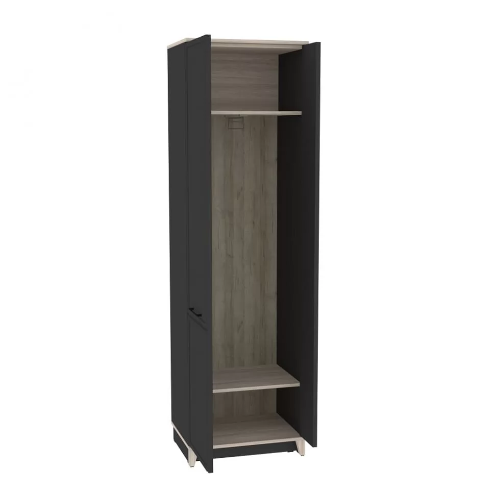 Ширина (мм): 600 Высота (мм): 2057 Глубина(мм): 455 Цвет корпуса: Белый-Блеквуд Сатиновый, Антрацит-Блеквуд Сатиновый Ручка-скоба металлическая (черный матовый) Петли: накладные Полки: регулируемые по высоте нагрузка на полку (кг): до 10 Материал корпуса: ЛДСП Материал фасада / вставок: ЛДСП