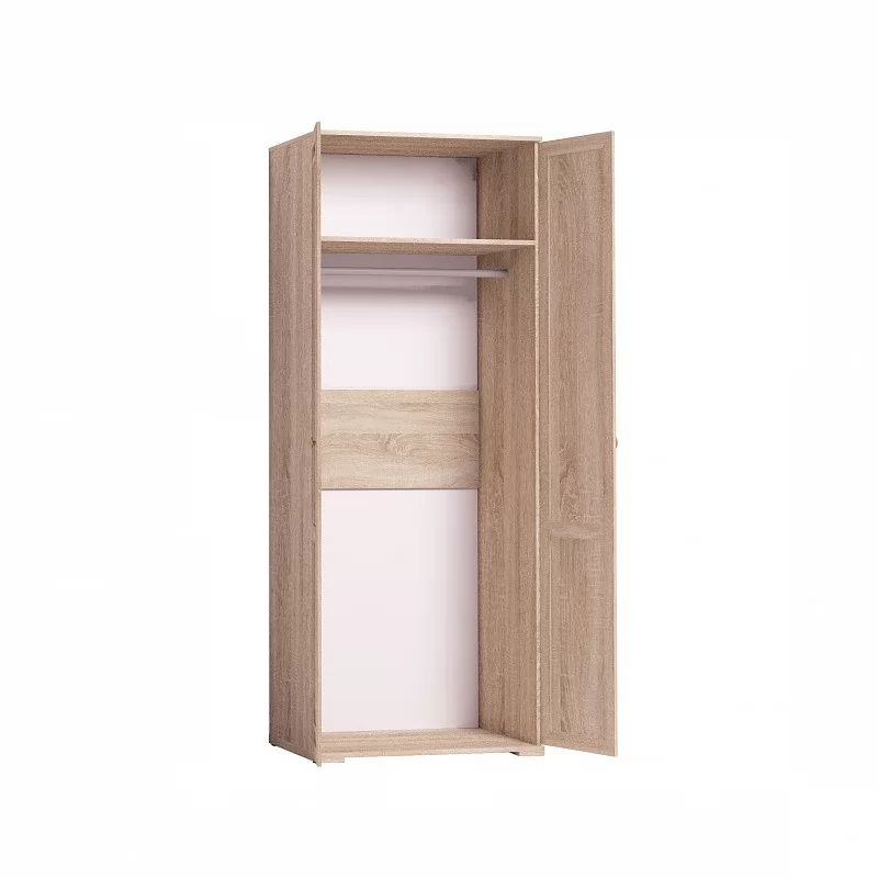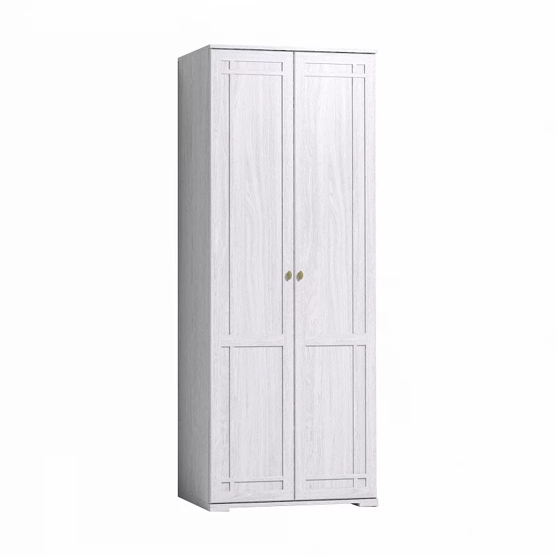 В распашном платяном шкафу со стационарной штангой для одежды длиной 757 мм можно разместить до 10 плечиков с тяжелой верхней одеждой. На верхней полке можно хранить аксессуары и коробки с головными уборами.