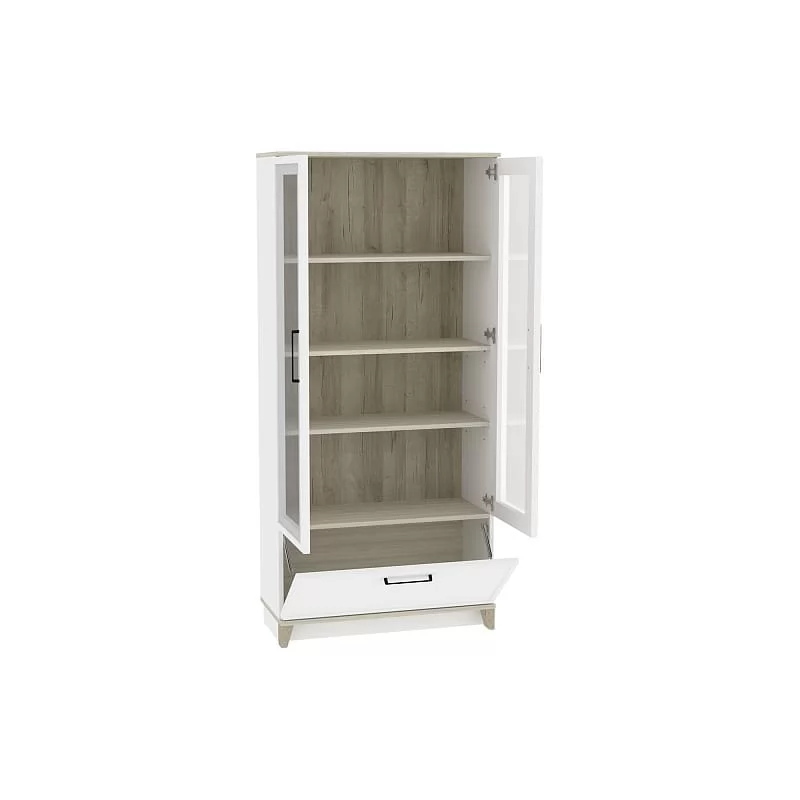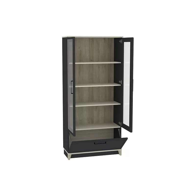 Мебель AURELIO представляет собой классическую мебель в современном исполнении. Корпус мебели изготовлен из высококачественного ЛДСП толщиной 16 мм, что обеспечивает прочность и долговечность конструкции. Фасады выполнены из МДФ с применением профиля, что придает им изысканный и стильный вид. Особое внимание стоит уделить рамочным фасадам шкафов, которые украшены стеклянными вставками и металлическими черными ручками. Это сочетание материалов придает мебели особый шарм и элегантность.