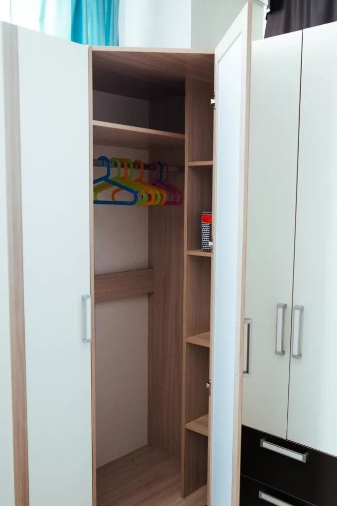 2. Шкаф имеет отделение со штангой для вещей на вешалках, полку над ней и секцию с 4 полками.