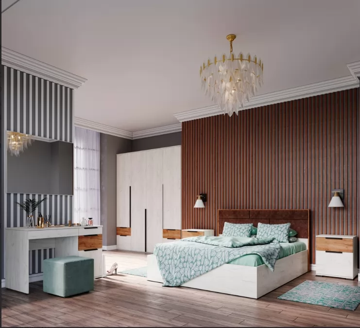 Увеличенная высота шкафов. 4 варианта основания для кровати: настил из ДСП 2С, настил из ЛДСП, ортопедическое основание на опорах, ортопедическое основание с подъемным механизмом и ящиком для хранения белья, внутреннее наполнение шкафа ЛСШ-23 — полки, выдвижные ящики и штанга стационарная металлическая.