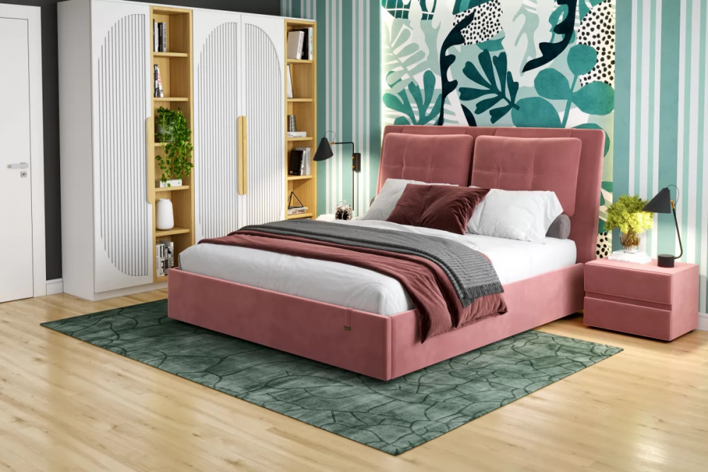 Кровати выполнены в нейтральных и в ярких тканях велюр, что позволяет подобрать подходящий вариант почти под любой интерьер. В качестве декора применяются декоративные подушки на изголовье.