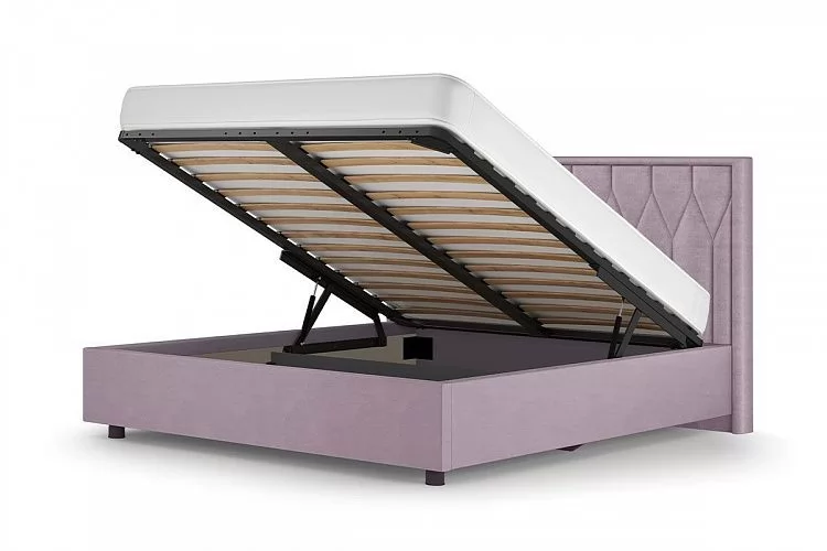 Каркас кровати выполнен из ЛДСП, особую прочность кровати придает металлический держатель основания из стали 2 мм. Подъемное основание оснащено надежным газлифтом.