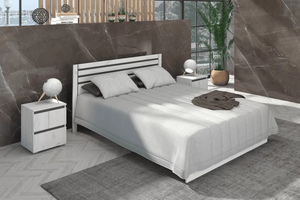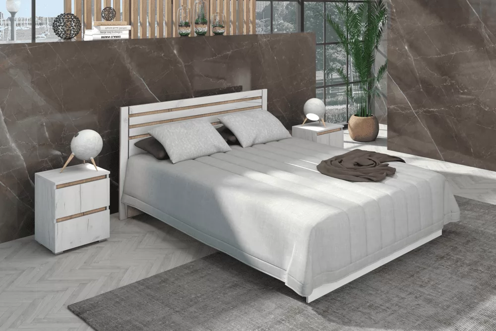 Изящная и функциональная спальня "Лиана" выполнена в модном цвете ЛДСП крафт белый с контрастными вставками цвета графит, либо крафт золотой. Кровать "Лиана" с настилом из ЛДСП рассчитана на нагрузку до 90кг на 1 спальное место.  Матрас в комплектацию кровати не входит и приобретается отдельно