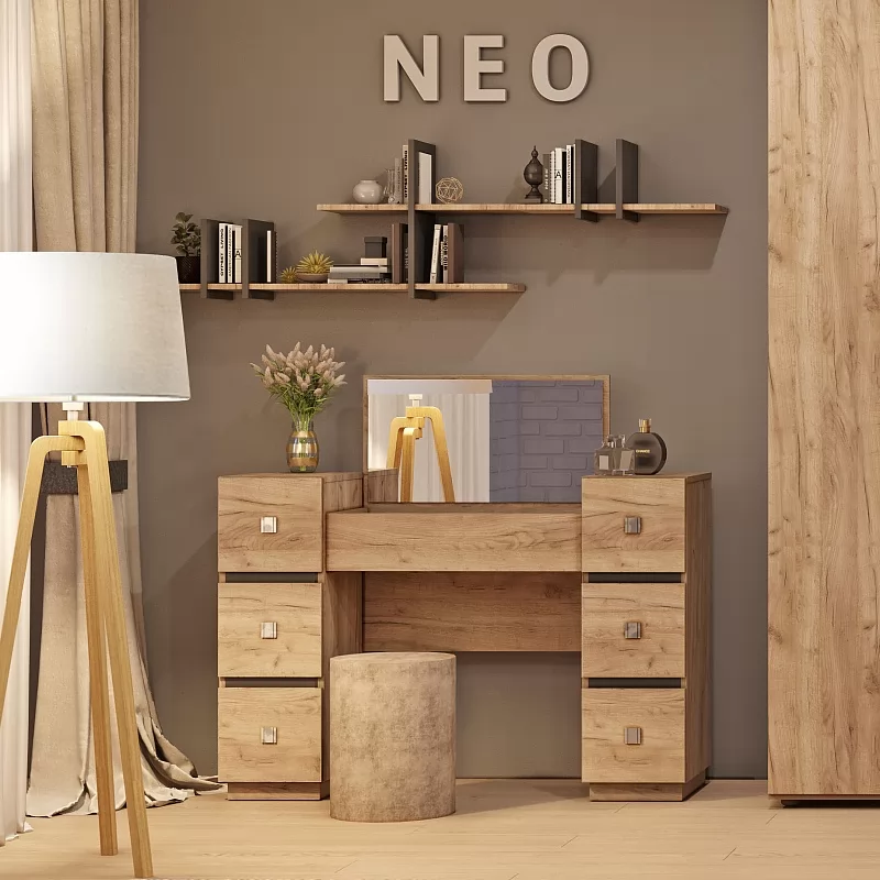 Туалетный столик просто необходим красивой женщине, которая привыкла за собой ухаживать не бегом, в ванной или прихожей, а обстоятельно. Стильный и функциональный он не займет много места в маленькой спальне. Разместите его в спальне у окна, и лучший естественный свет вам обеспечен. Откидная крышка стола с зеркалом скрывает нишу с делителем для хранения мелких аксессуаров, а в 6-ти выдвижных ящиках, глубиной 30 см, высотой 15 см и шириной 20 см, найдется место для множества баночек и флакончиков. Кроме того, ящики оснащены шариковыми направляющими, что обеспечивает их движению плавных ход и минимальный люфт.